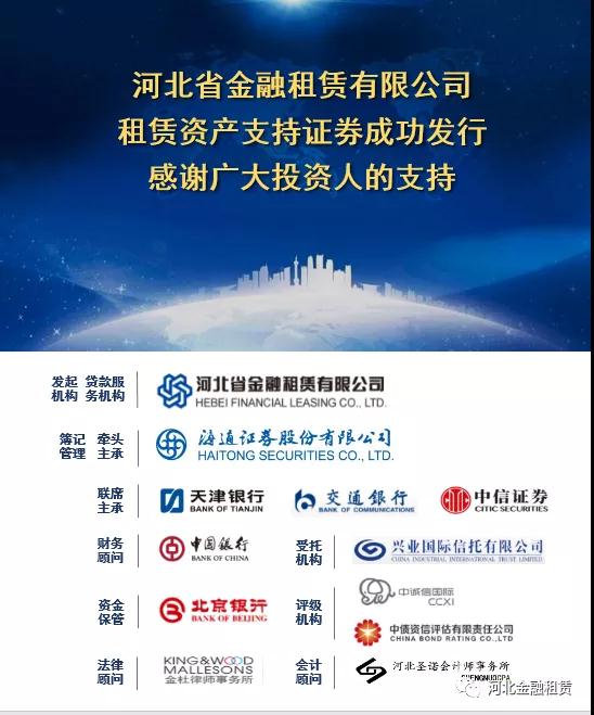 日前,河北省金融租賃有限公司(以下簡(jiǎn)稱“河北金租”)冀租穩(wěn)健2020年第一期租賃資產(chǎn)支持證券在銀行間債券市場(chǎng)成功簿記建檔發(fā)行,獲得了交通銀行、中國(guó)銀行等大型國(guó)有銀行及其他各類銀行的踴躍認(rèn)購,合計(jì)金額15.65億元。